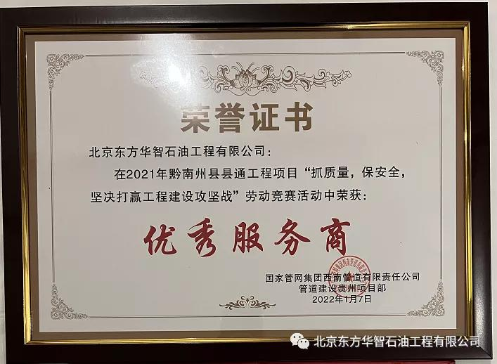 为了推进重点工程项目的建设,激发员工和参建队伍的劳动热情,弘扬实干精神,国家管网集团西南管道有限责任公司表彰了工程建设劳动竞赛的优秀集体和个人。在与中石油、中石化等5家设计单位的考核中,我公司排名第一,喜获标杆设计单位。并荣获贵州项目部颁发的“优秀服务商”,同时廖兆龙荣获“先进个人”。