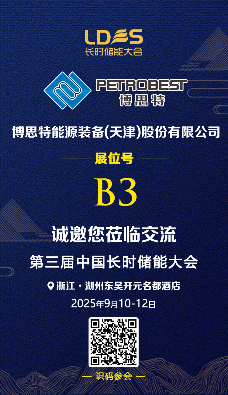 中国长时储能大会是我国深度聚焦各类长时储能技术应用和发展的专业线下会议,本次大会定于9月10-12日在浙江湖州东吴开元名都酒店召开。日前,专注于能源领域解决方案的国家级制造业单项产品冠军企业—博思特能源装备(天津)股份有限公司(简称“博思特”)将携压缩空气储能旋风分离器、脱氯装置、高温高压大口径关键控制阀门等核心产品亮相展会,诚邀您到场莅临指导,洽谈合作。